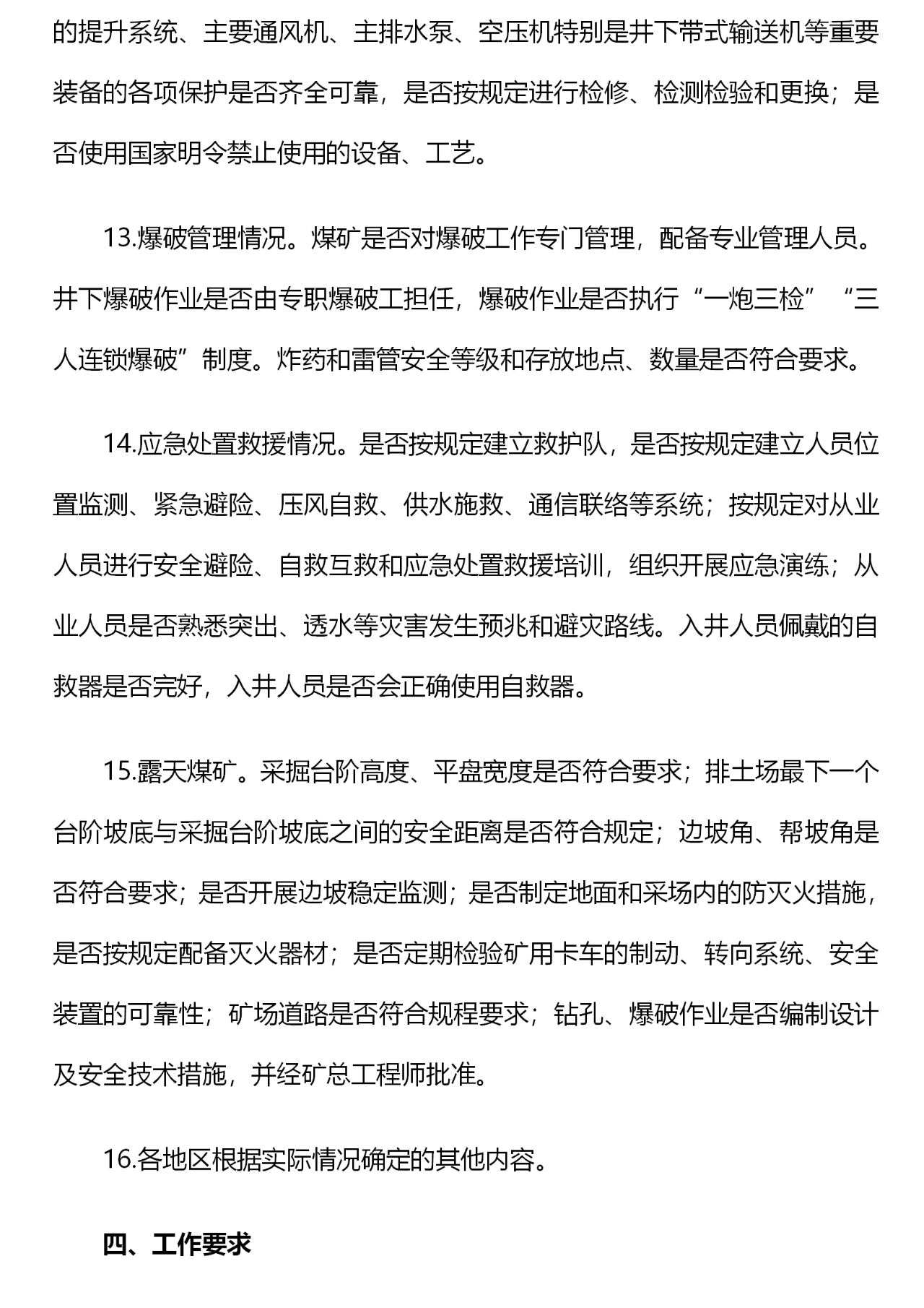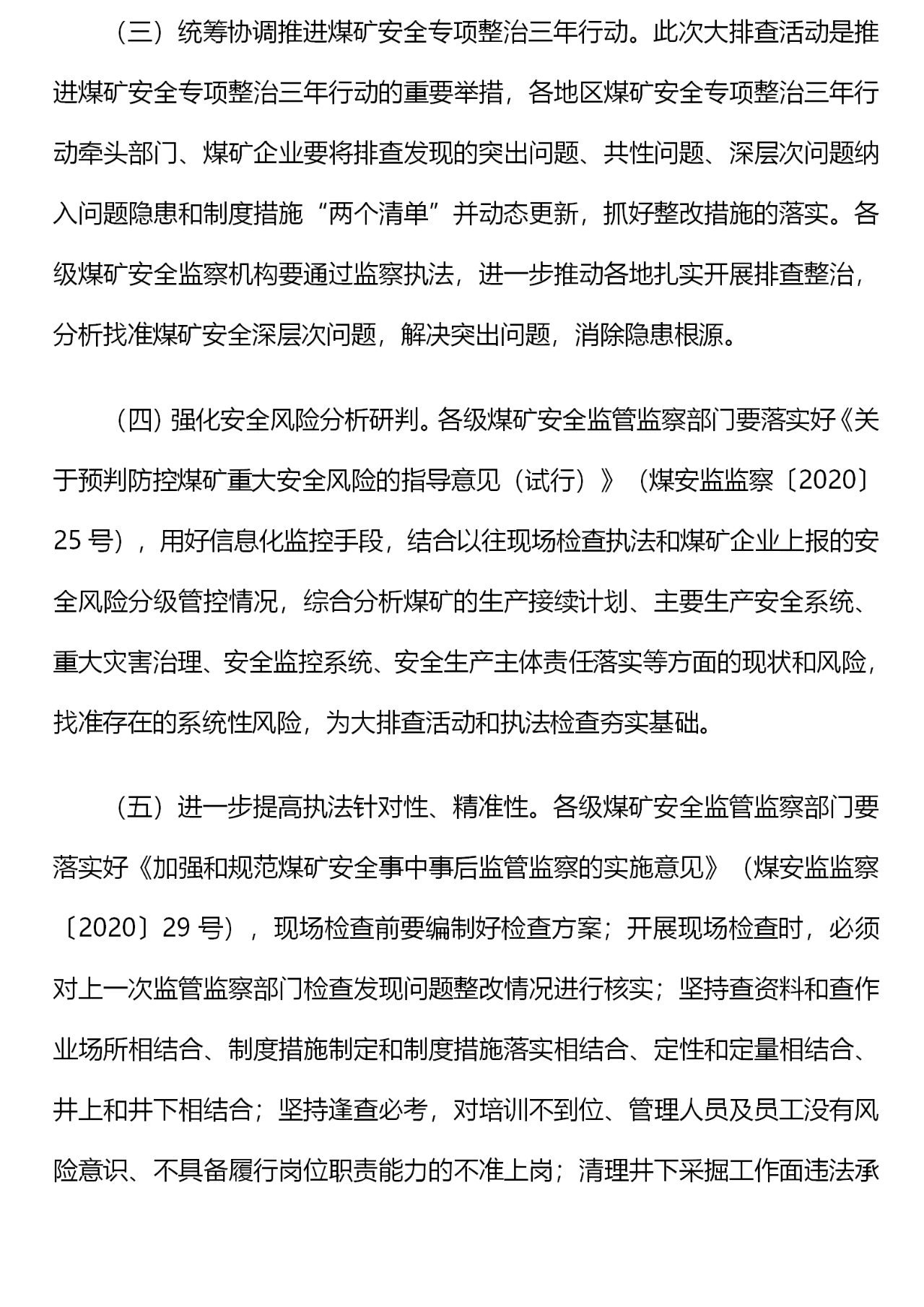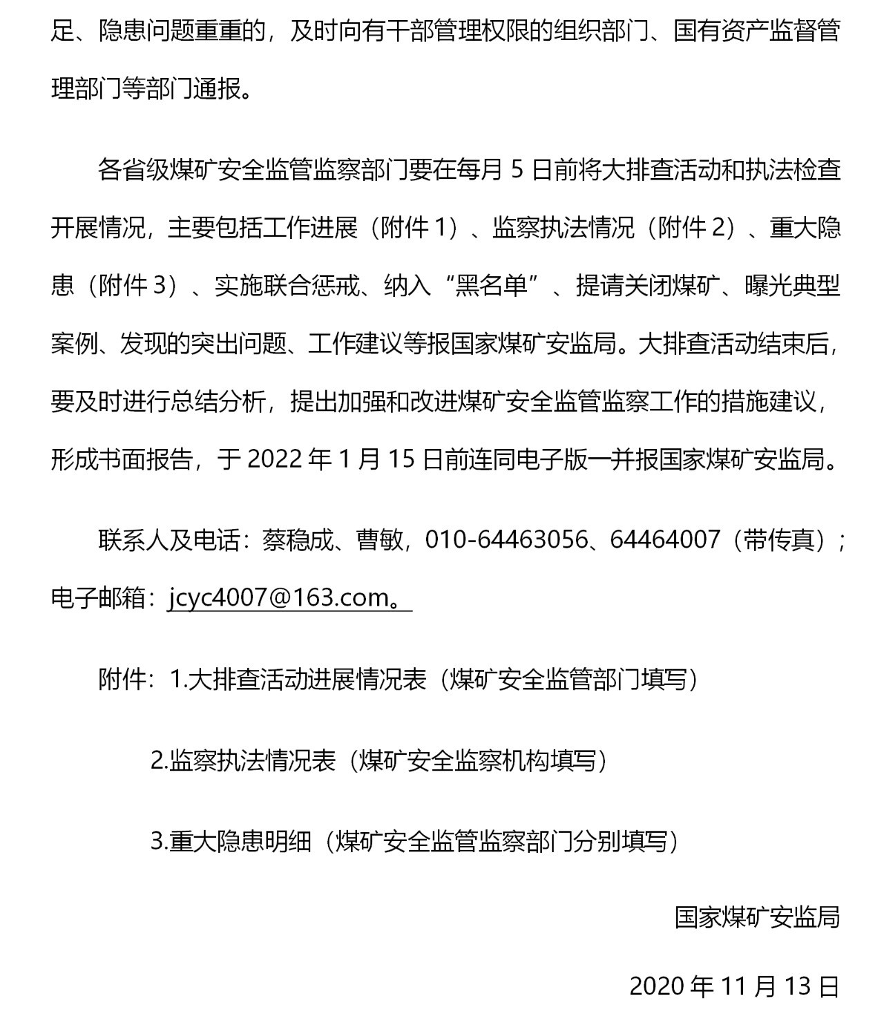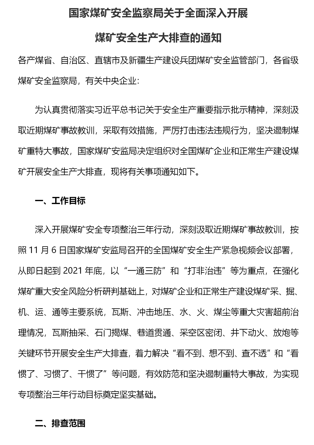 通知指出,从即日起到2021年底,对全国煤矿企业及正常生产建设煤矿,以“一通三防”和“打非治违”等为重点,在强化煤矿重大安全风险分析研判基础上,对煤矿企业和正常生产建设煤矿采、掘、机、运、通等主要系统,瓦斯、冲击地压、水、火、煤尘等重大灾害超前治理情况,瓦斯抽采、石门揭煤、巷道贯通、采空区密闭、井下动火、放炮等关键环节开展安全生产大排查,着力解决“看不到、想不到、查不透”和“看惯了、习惯了、干惯了”等问题,有效防范和坚决遏制重特大事故,为实现专项整治三年行动目标奠定坚实基础。