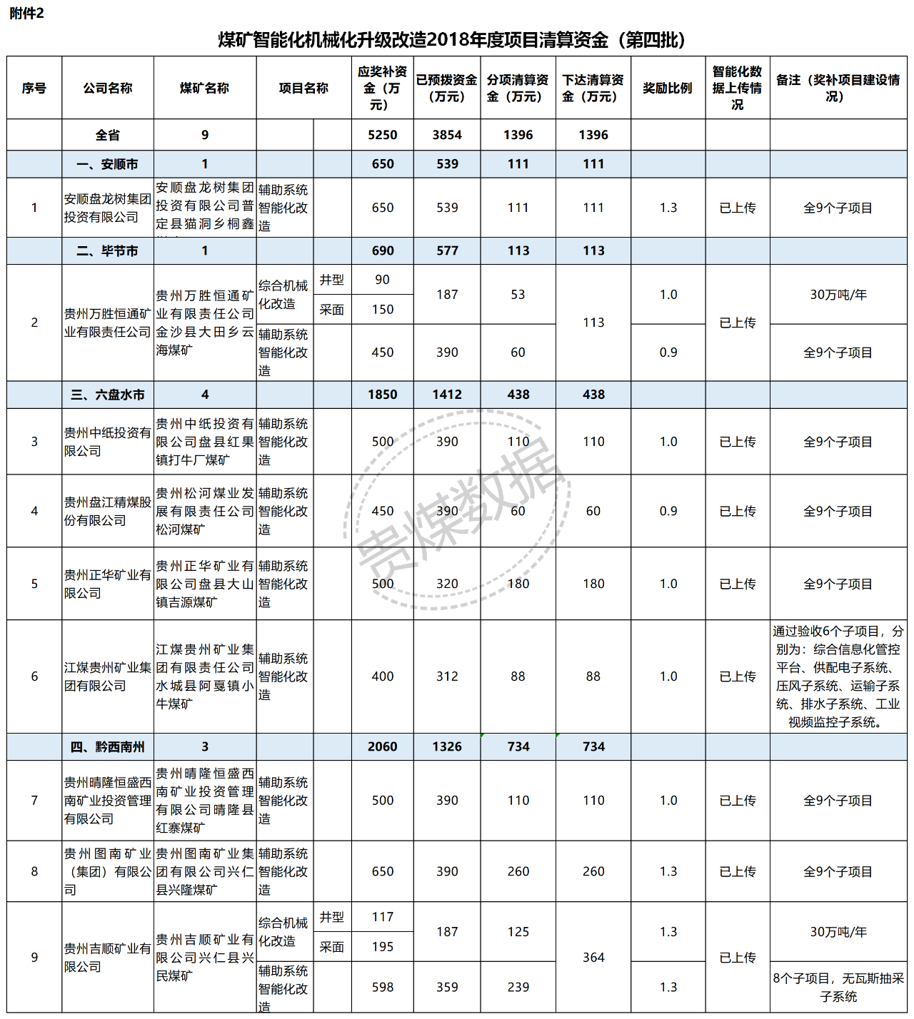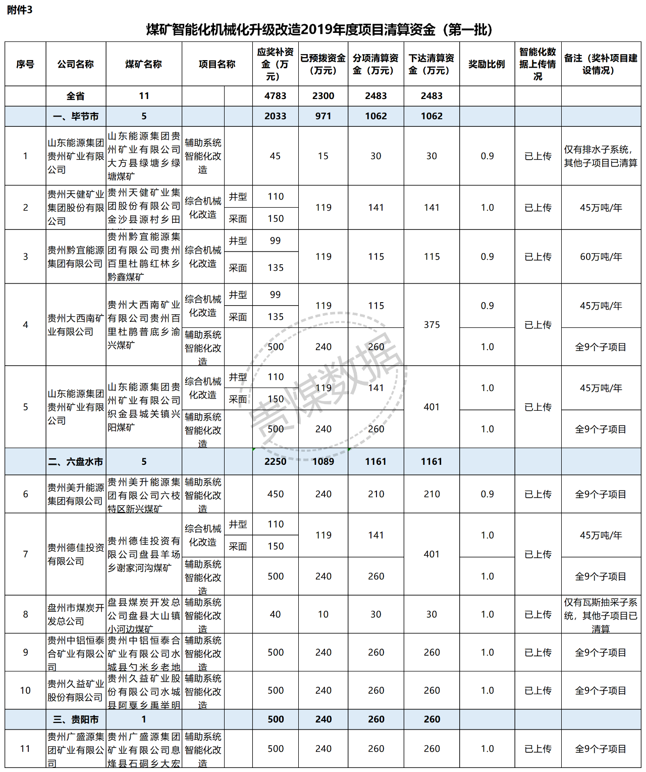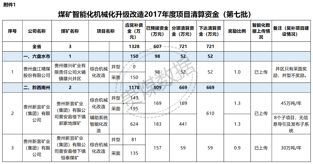 按照《省人民政府关于煤炭工业淘汰落后产能加快转型升级的实施意见》(黔府发〔2017〕9号)、《贵州省煤炭结构调整转型升级专项资金管理办法》(黔财工〔2017〕95号)等文件精神和要求,根据财政预算安排,省能源局拟下达煤矿智能化机械化升级改造奖补清算资金。合计4313万元。
