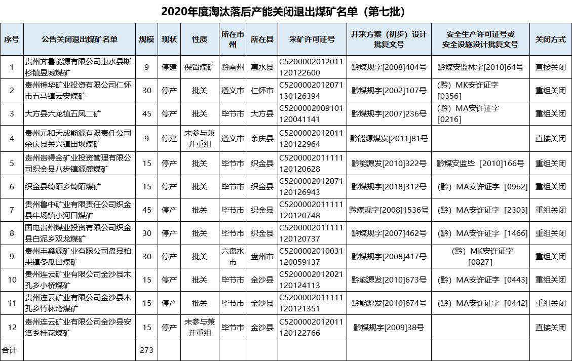 按照《国务院关于煤炭行业化解过剩产能实现脱困发展的意见》(国发〔2016〕7号)、《贵州省人民政府关于煤炭工业淘汰落后产能加快转型升级的意见》(黔府发〔2017〕9号)要求,各市(州)人民政府、有关县(市、区、特区)人民政府对2020年企业自愿申请关闭的安全生产条件差、资源枯竭、布局不合理和不符合国家产业政策的煤矿(含矿权)进行了审查,贵州省煤炭工业淘汰落后产能加快转型升级工作领导小组办公室现将经公示无异议的企业自愿申请关闭12处煤矿名单予以公告(详见附件),请各市(州)、有关县(市、区、特区)人民政府按要求做好以下工作。